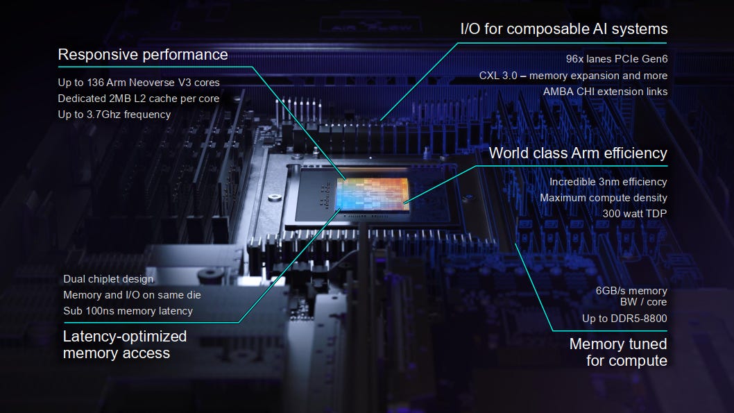 Its a server CPU based on Arm’s Neoverse V3 server core, with up to 136 of these cores on dual chiplets.