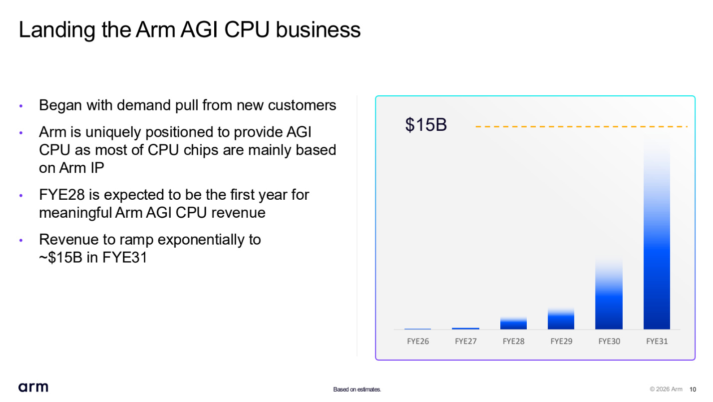 And the key reason for this initial excitement: Arm projects revenue of up to $15 billion from its AGI CPU business by 2031.