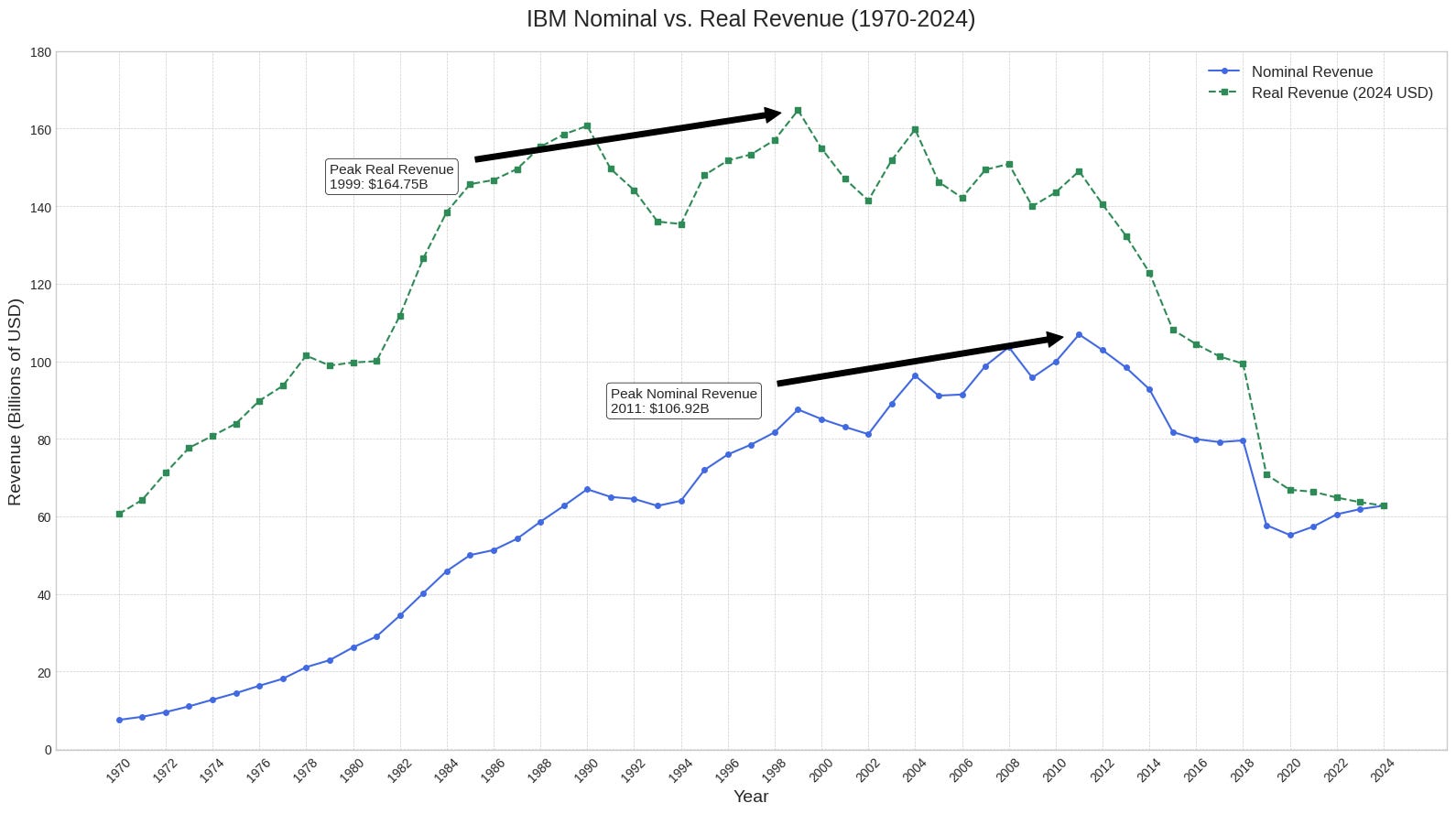 In 1985 IBM had revenue of slightly more than $50 billion, or adjusted for inflation, around $150 billion. This compares with revenue in 2024 for Microsoft of $245 billion, Alphabet $350 billion, Apple’s $391 billion, and only $60 billion for Nvidia.