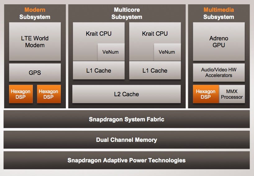 The Snapdragon 4 Plus SoC in 2012 had three Hexagon cores, two powering the modem and one, sitting alongside the Adreno GPU, MMX Processor and Audio/Video accelerators, in the design’s Multimedia Subsystem. This is all distinct from the, Qualcomm-designed Krait Arm cores.