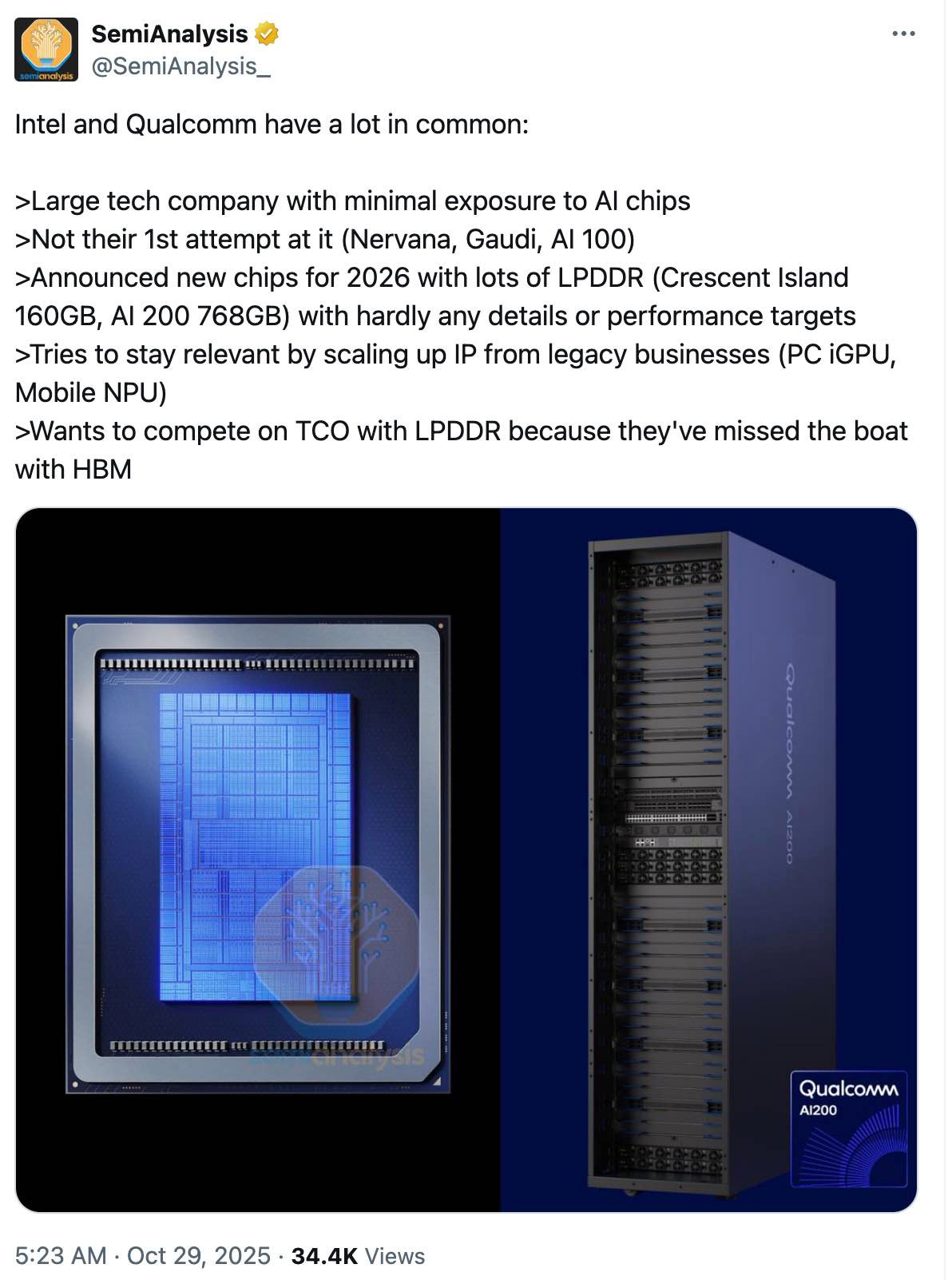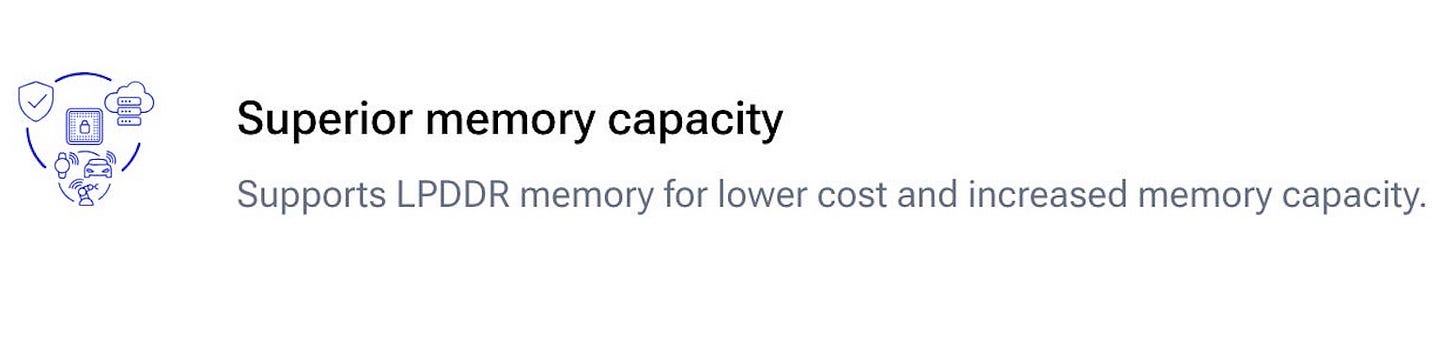 Part of this is probably Qualcomm’s use of LPDDR memory rather than the more expensive and scarce HBM. This should allow higher memory capacity - Qualcomm quotes up to 768GB per card - as well as reducing costs.