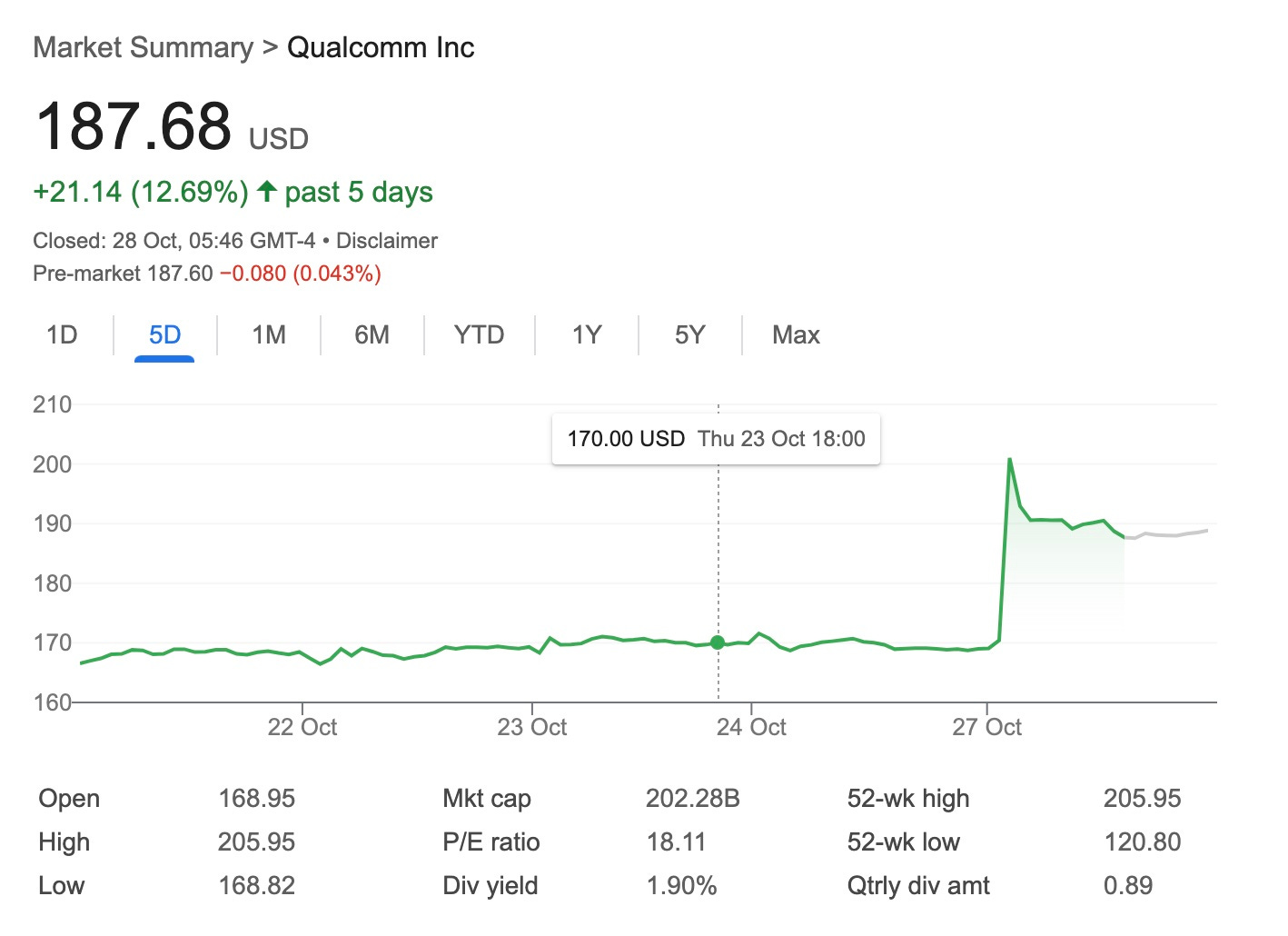 Despite all this the AI200 and AI250 announcements led to a pop in Qualcomm’s share price on the day.